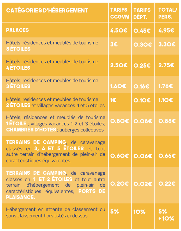 En 2005, la CCGVM a instauré une taxe de séjour sur l’ensemble du territoire. Le montant de la taxe est fixé par délibération votée en Conseil de Communauté. Les élus intercommunaux ont souhaité instaurer une taxe calculée au réel plus équitable qu’une taxe forfaitaire.